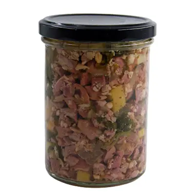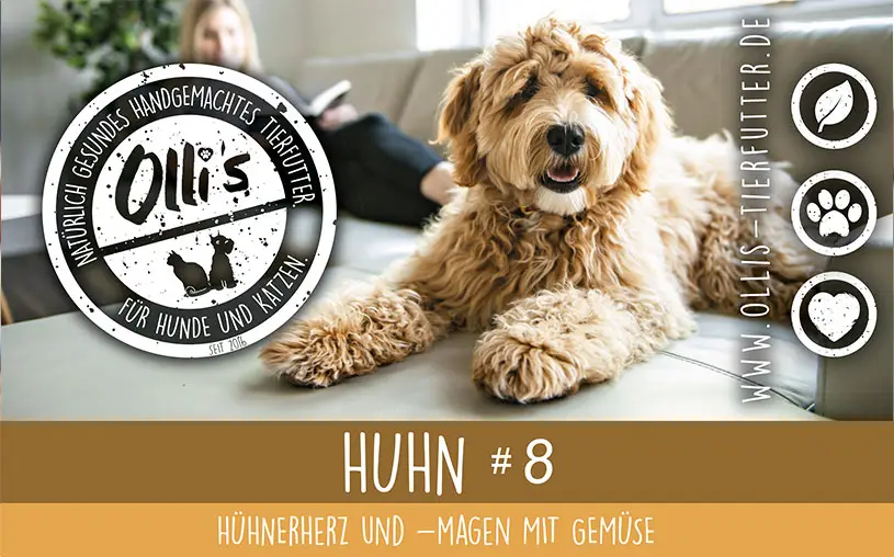 Hühnerherz und -magen 80%, Kartoffeln 8%, Spinat 6.5%, Brühe mit Aspik 3%, Rote Beete 1,25%, Rapsöl / Hühnerfett 1,5% ohne weitere Zusatzstoffe