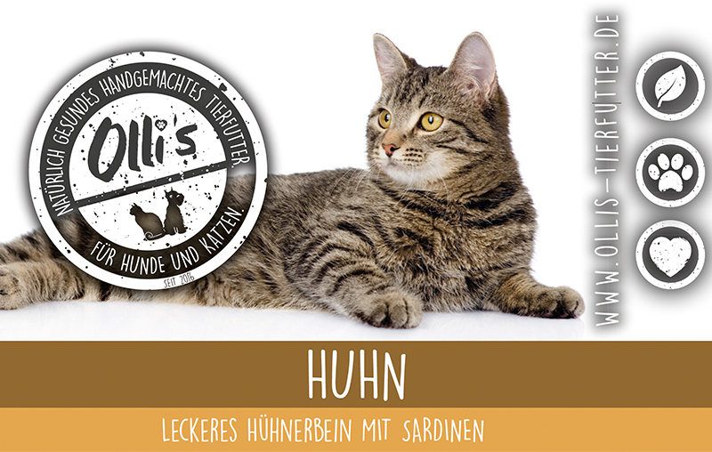 Hühnerbein ohne Knochen mit Sardinen, Lachsöl und Seealgen. Verfeinert mit Gemüse, Hirse und Reis.