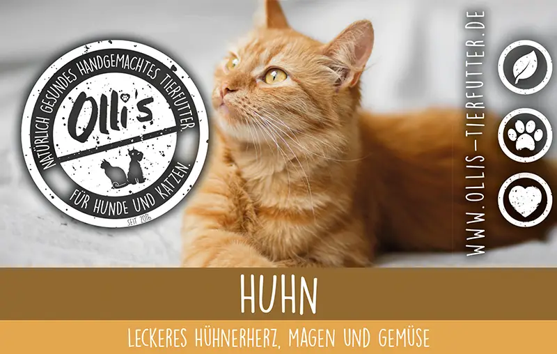 Hühnerherz 40.9%, Hühnermägen 40,9%, Reis 7,7%, Juliennegemüse 7,7%, Brühe 1,5%, Lachsöl 1%, Seealgen, Taurin > 1%